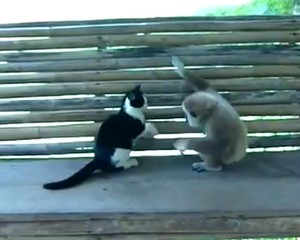 Apina härnää kissaa antamalla kaikkensa.